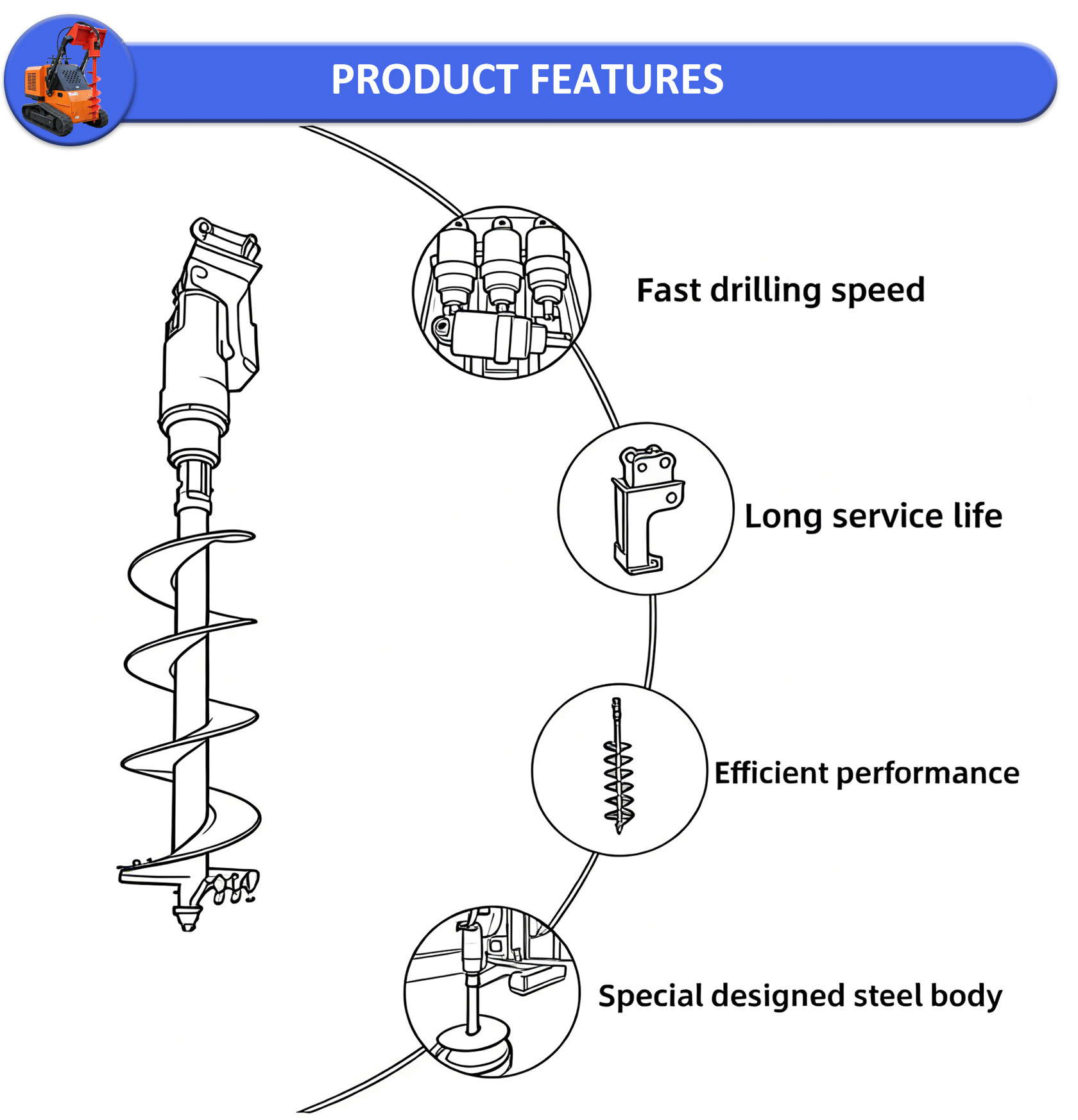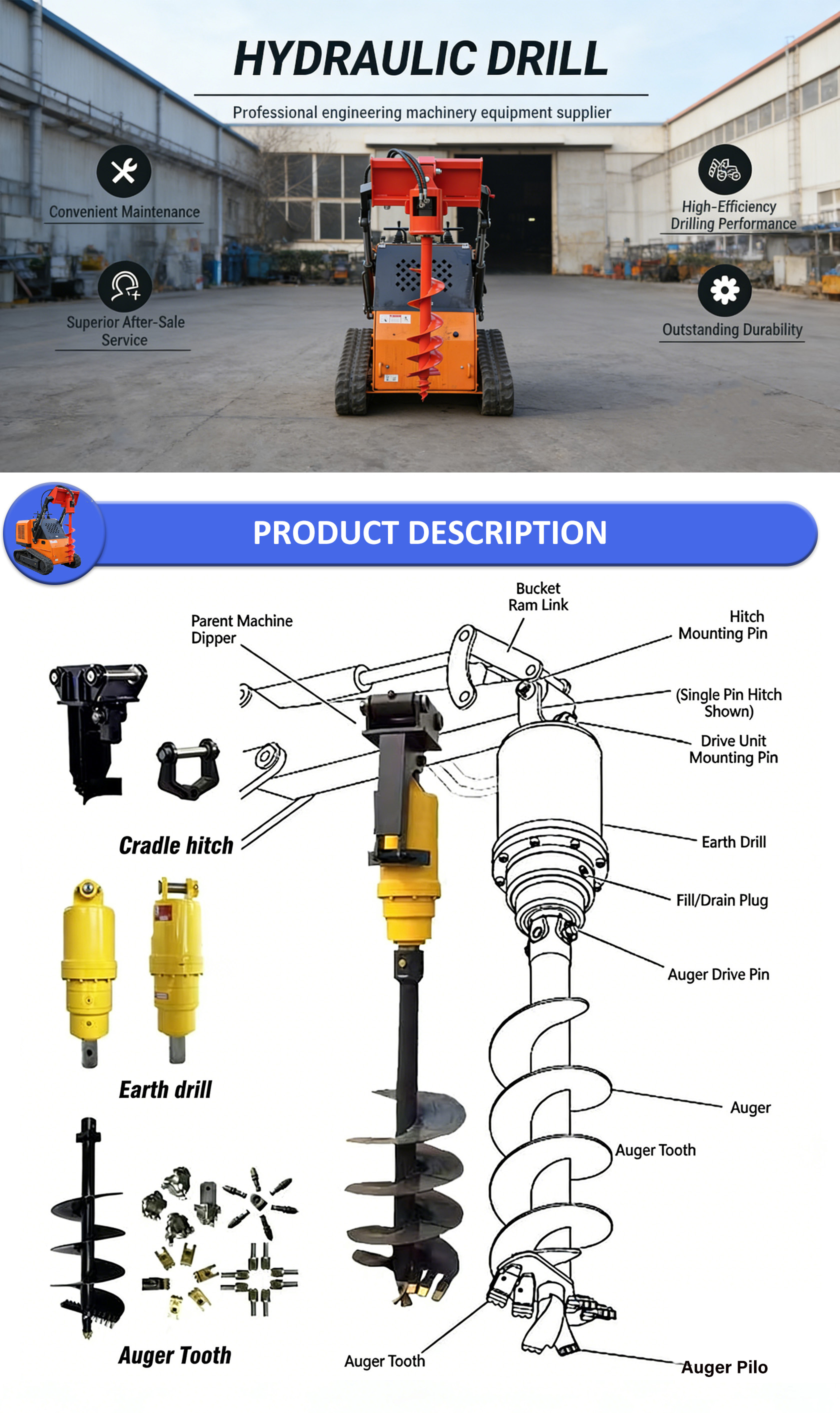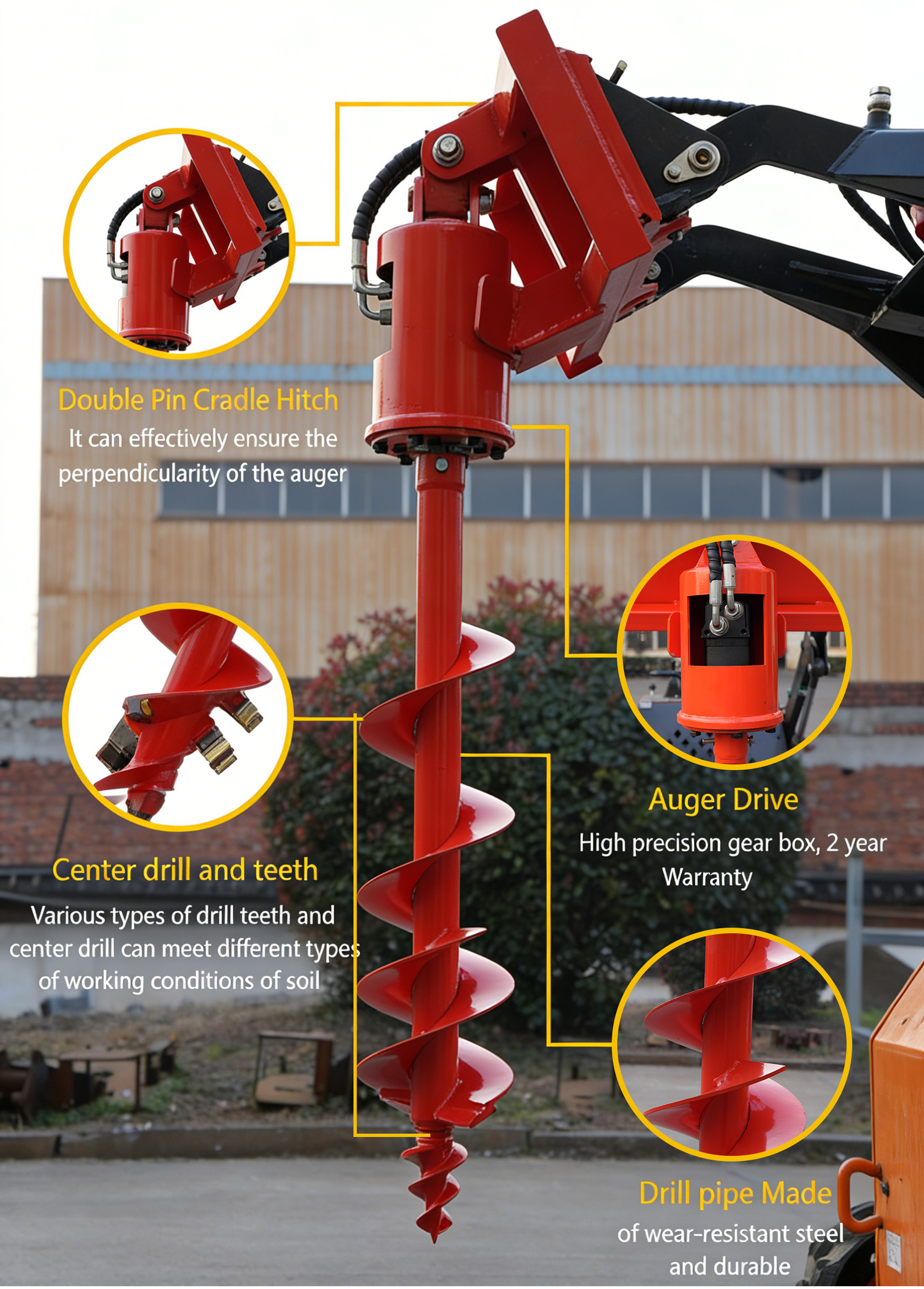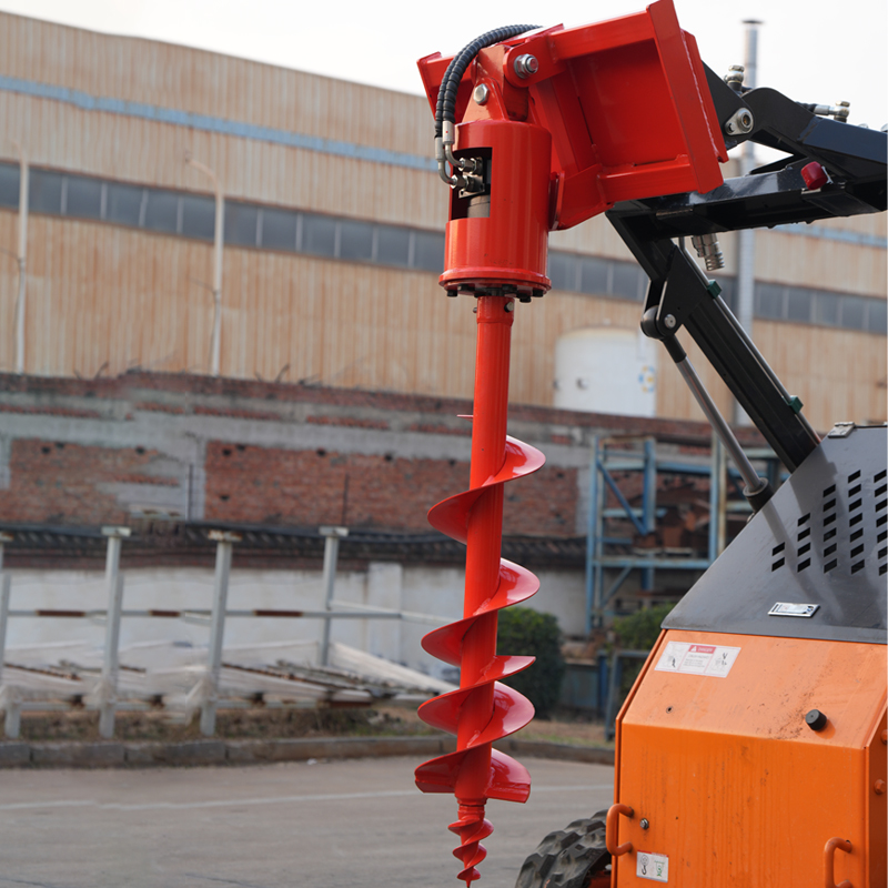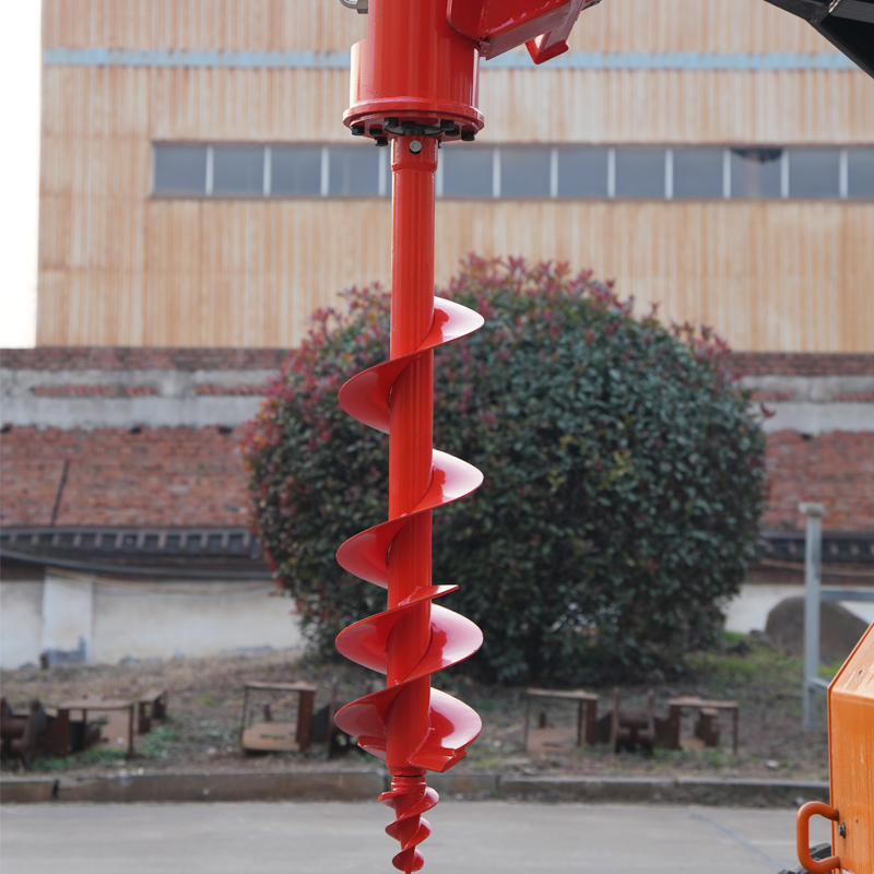 An auger is a spiral blade drilling rig that includes a rig frame, a slide on the frame, and a reduction box that slides up and down the slide. The gearbox is connected to the power input shaft and the PTO shaft. The other end is connected to the hydraulic motor, the other end of the PTO shaft is connected to the drill pipe, and the lower end of the drill pipe is connected to the drill bit, which can be widely used in orchard planting, municipal engineering, etc.