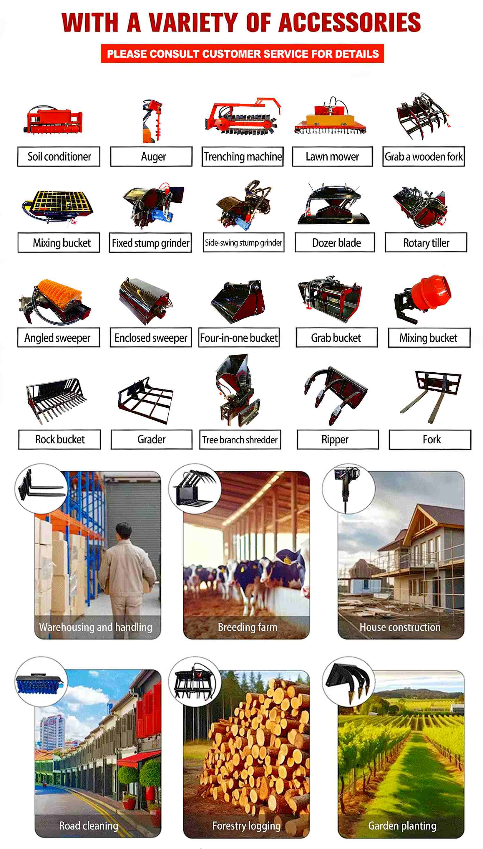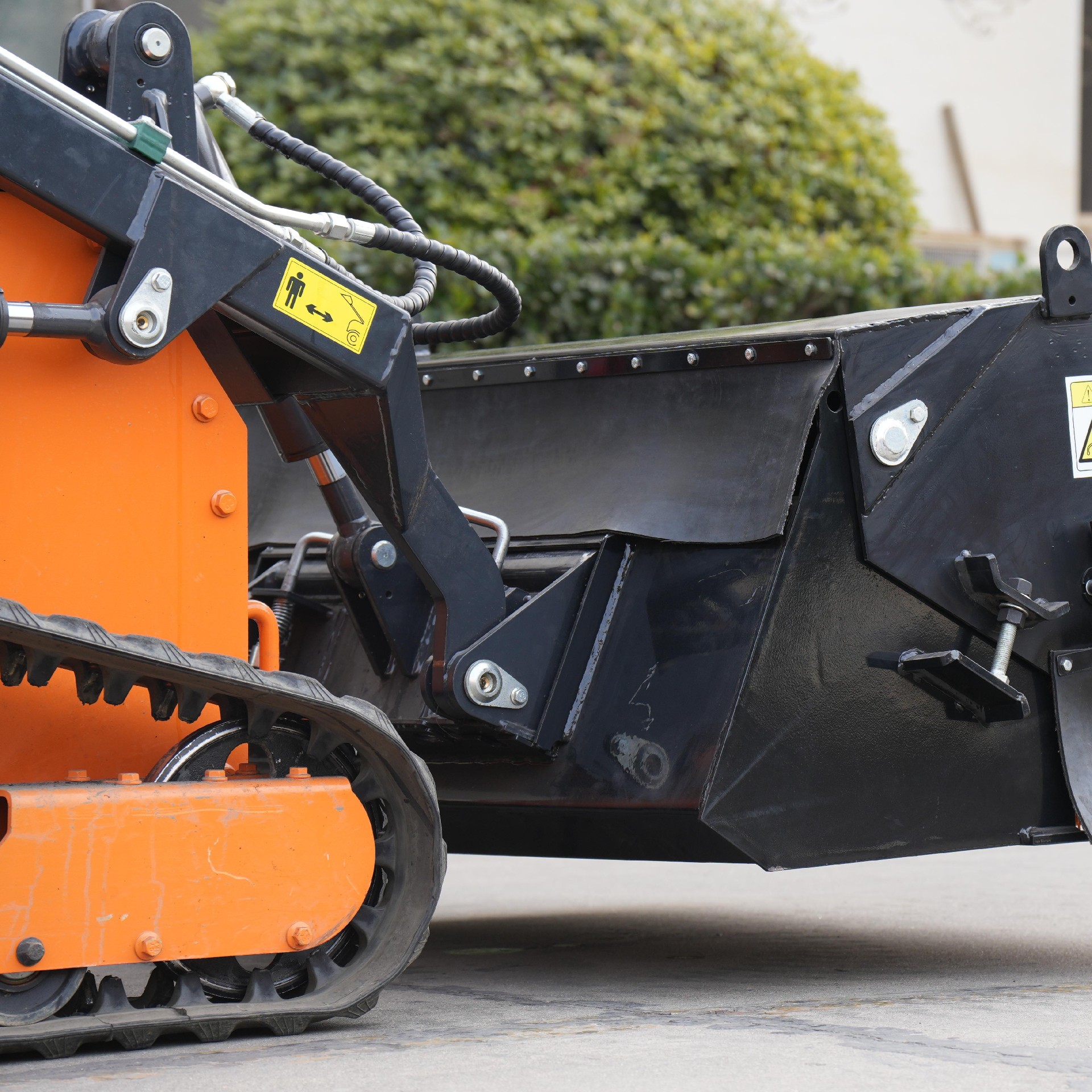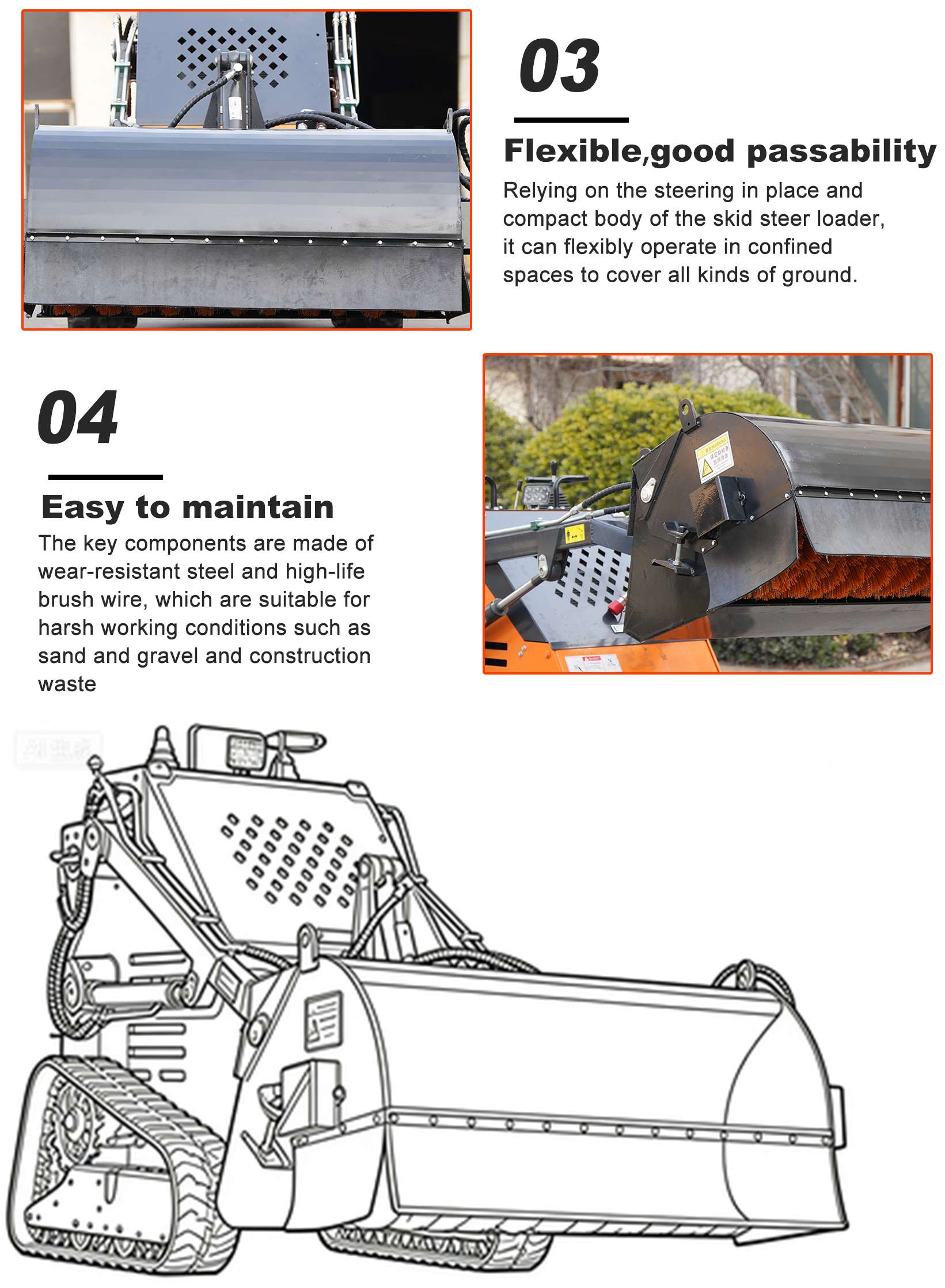 A high-efficiency cleaning attachment mounted on the front end of the skid steer loader. It adopts a fully enclosed housing design that throws garbage into the built-in collection bucket by rotating the brush barrel, effectively reducing dust. It is suitable for cleaning garbage, gravel and snow in narrow sites, municipal roads, industrial parks and parking lots