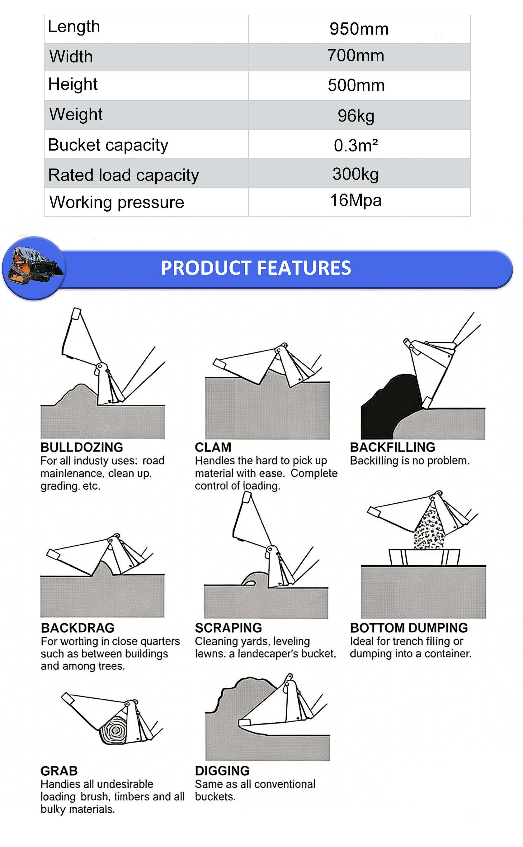 4-in-1 bucket The Skid Steer 4-in-1 Multi-Purpose Bucket is the ultimate attachment for versatility and productivity. Engineered for compact loaders, this hydraulic attachment combines four critical functions into one robust tool, eliminating the need for frequent equipment changes on the job site. Length:950mm Width:700mm Height:500mm Weight:96kg Bucket capacity:0.3m³ Request Quote *Name *Country / Region *Email *Phone number / Whatsapp number Favorite product Crawler Excavator Mower Electric Excavator Excavator Accessories Loader Forklift Crane Aerial work machinery Mini Dumper Customized Others Loader Accessories How would you like us to contact you? Email Phone Whatsapp Content Verification code Submissions Loading... A key to share Selling point Configuration Video Introduction Relevant Online message Request Quote *Name *Country / Region *Email *Phone number / Whatsapp number Favorite product Crawler Excavator Mower Electric Excavator Excavator Accessories Loader Forklift Crane Aerial work machinery Mini Dumper Customized Others Loader Accessories How would you like us to contact you? Email Phone Whatsapp Content Verification code Submissions Loading... Request price *Name *Country / Region *Email *Phone number / Whatsapp number Favorite product Crawler Excavator Mower Electric Excavator Excavator Accessories Loader Forklift Crane Aerial work machinery Mini Dumper Customized Others Loader Accessories How would you like us to contact you? Email Phone Whatsapp Content Verification code Submissions Loading... Back to previous We Accept: 4-in-1 bucket The Skid Steer 4-in-1 Multi-Purpose Bucket is the ultimate attachment for versatility and productivity. Engineered for compact loaders, this hydraulic attachment combines four critical functions into one robust tool, eliminating the need for frequent equipment changes on the job site. Length:950mm Width:700mm Height:500mm Weight:96kg Bucket capacity:0.3m³ DESCRIPTION SPECIFICATION 4-in-1 bucket 4-in-1 bucket Configuration Video Introduction Relevant Angle Broom Read more Enclosed sweeper Read more Soil conditioner Read more Mower Read more Hydraulic Breaker Read more Trenching machine Read more Auger Read more Online message *Name *Email *Phone / Whatsapp How would you like us to contact you? Email Phone Whatsapp Content Verification code Submissions Loading...