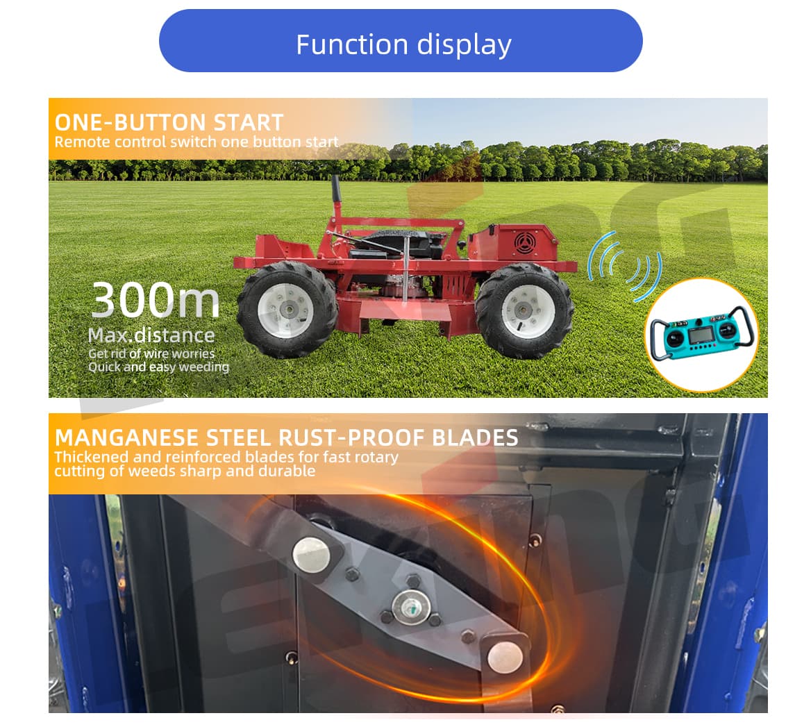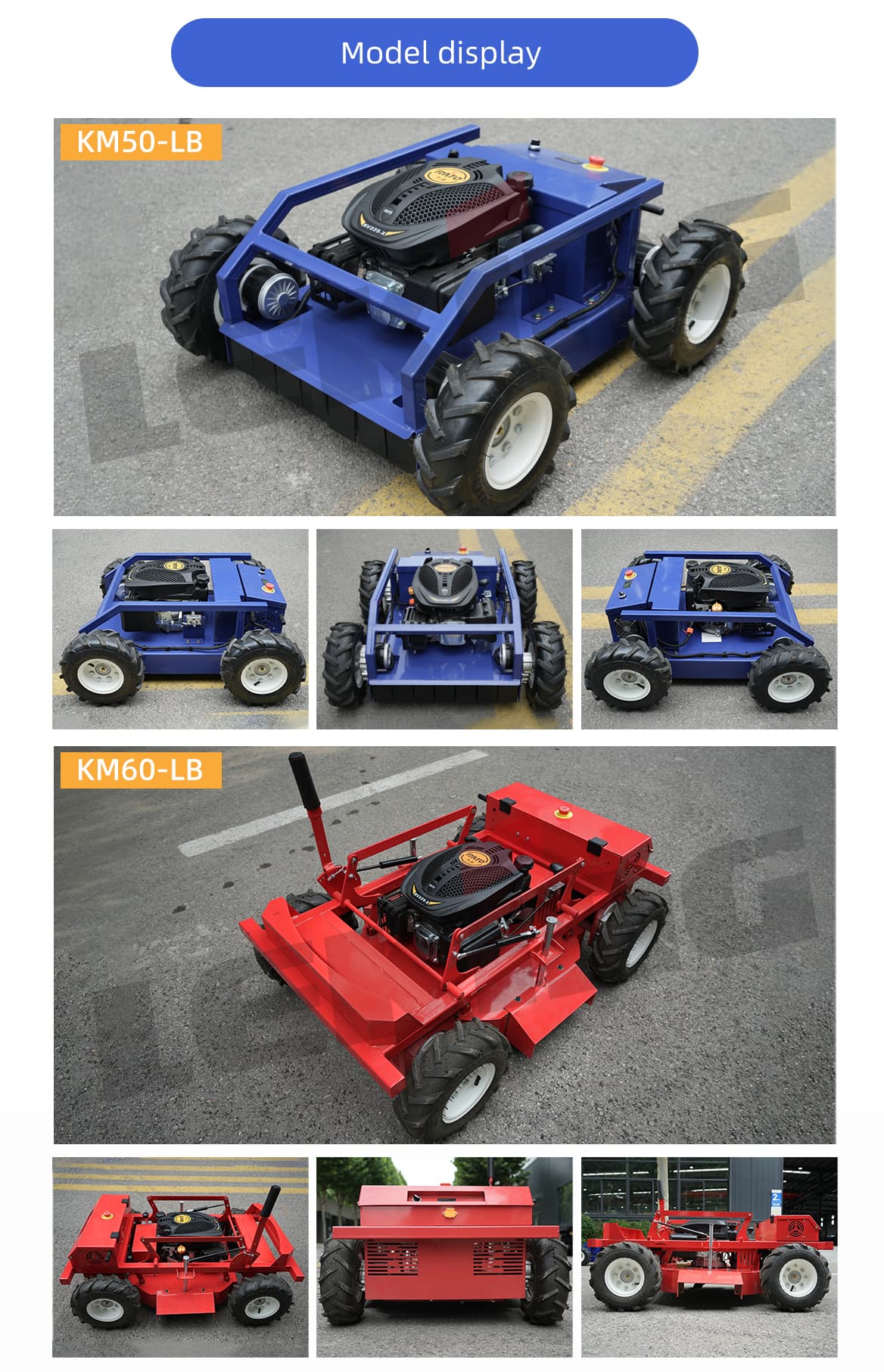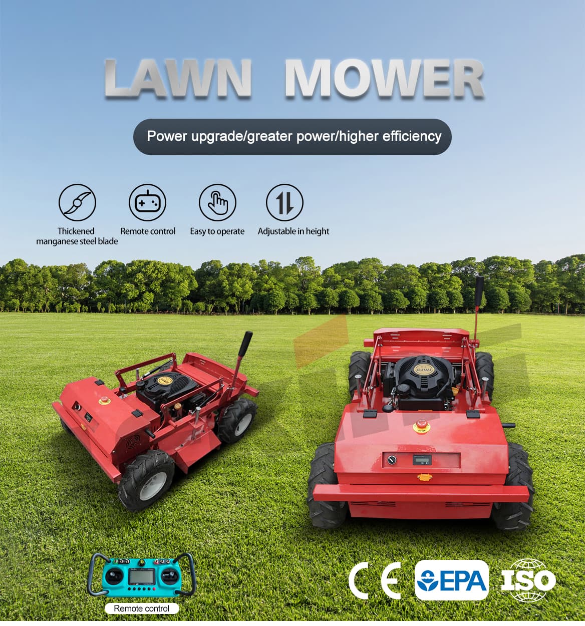 The remote control lawn mower is a remote control intelligent agricultural and forestry equipment, suitable for forestry, grassland, roads, dams, agriculture and forestry, orchards, vegetables, greenhouses, farms, ecological parks and other places. It has good weeding and climbing effects. It can be used in various terrains. It can trim various weeds and reeds. Scope of use: orchards, garden lawns, wasteland weeds.