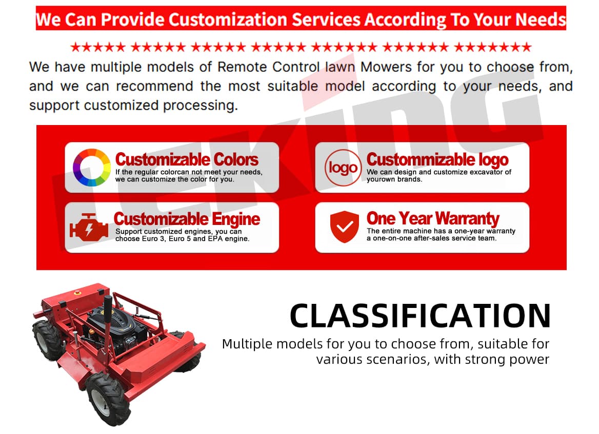 Engine:Kohler/Rato/Loncin Walking speed:5km/h Cutting width:600mm Cutting height:20-150mm Climb a slope:30°