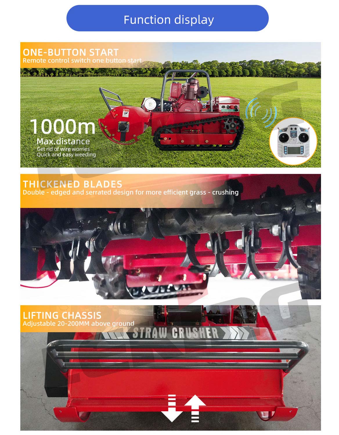 The remote control lawn mower is a remote control intelligent agricultural and forestry equipment, suitable for forestry, grassland, roads, dams, agriculture and forestry, orchards, vegetables, greenhouses, farms, ecological parks and other places. It has good weeding and climbing effects. It can be used in various terrains. It can trim various weeds and reeds. Scope of use: orchards, garden lawns, wasteland weeds.