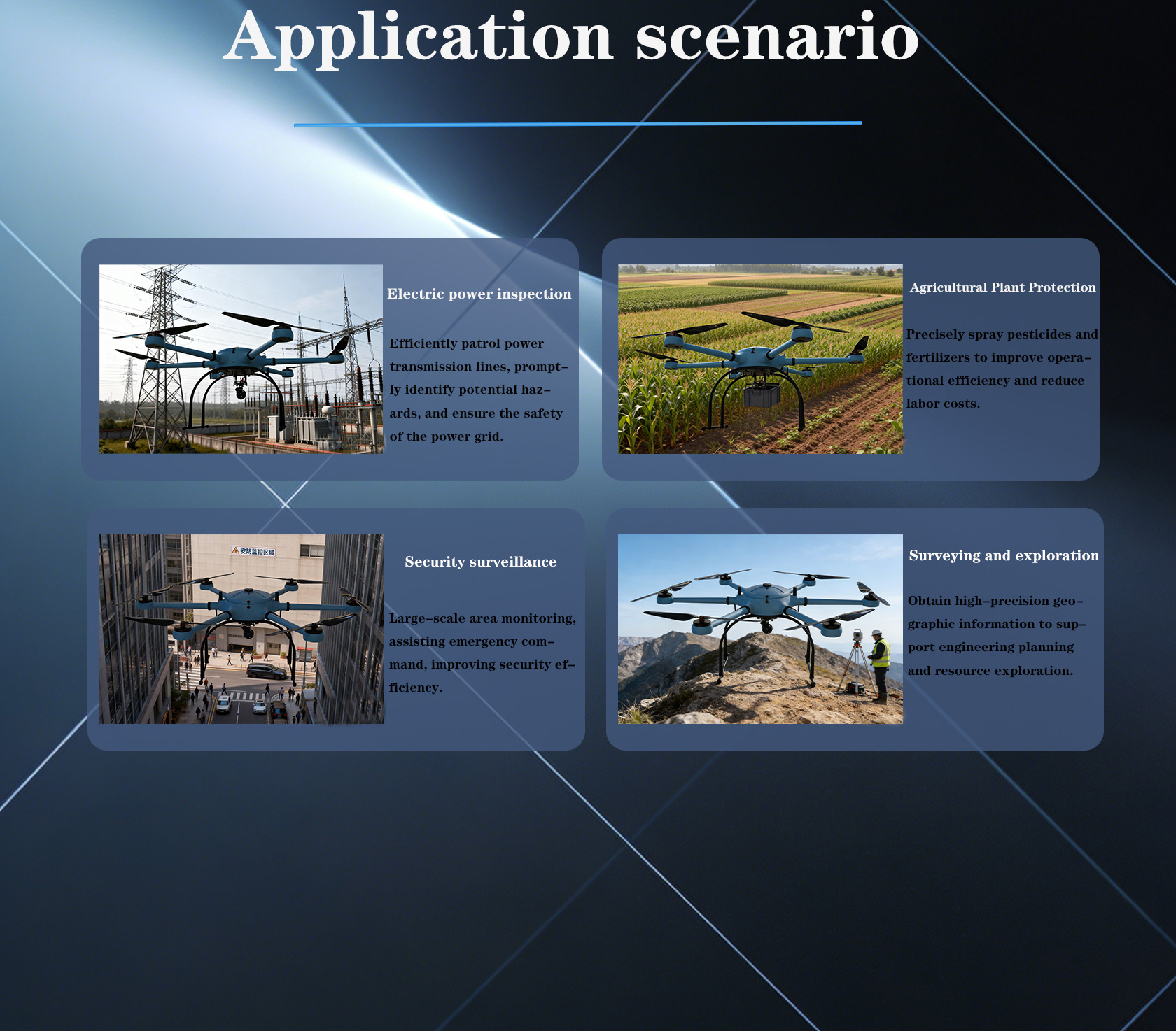 A high-performance six-rotor UAV platform designed for complex operating environments. Adhering to the design concept of "redundant safety", we provide you with stable and reliable heavy-duty flight solutions through powerful power systems and intelligent flight control technology. Whether it is professional film and television production, high-precision surveying and mapping, or industrial inspection, it can meet the most demanding tasks with excellent wind resistance and load capacity
