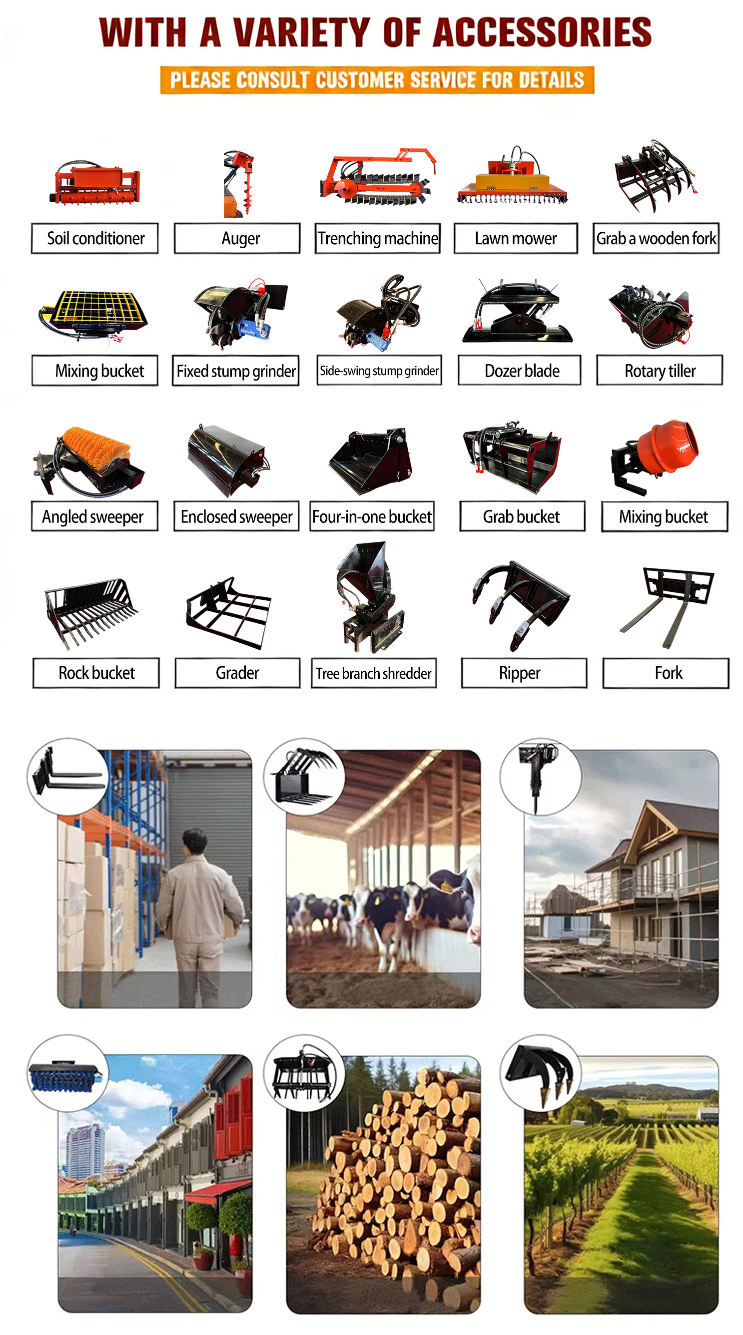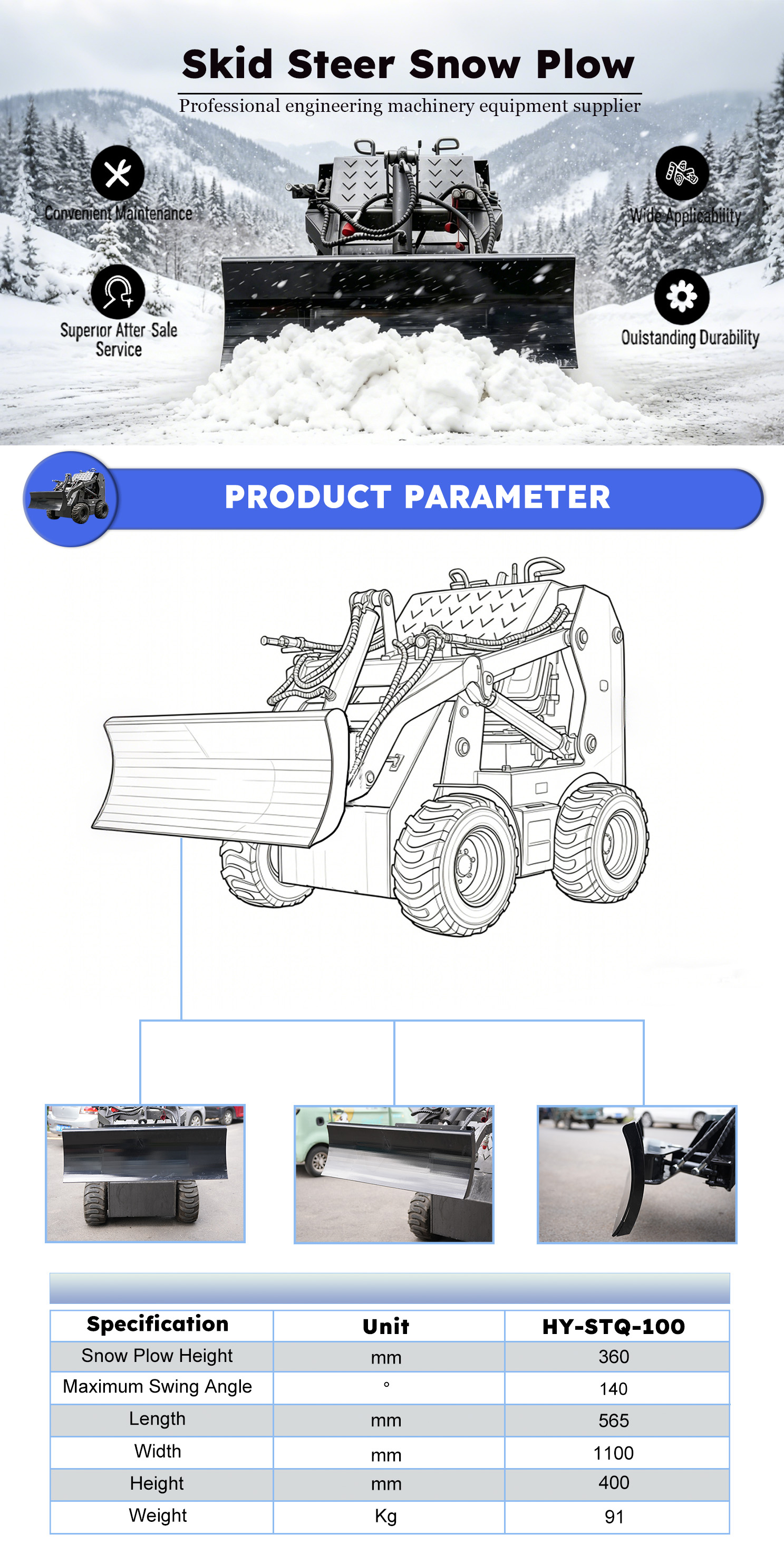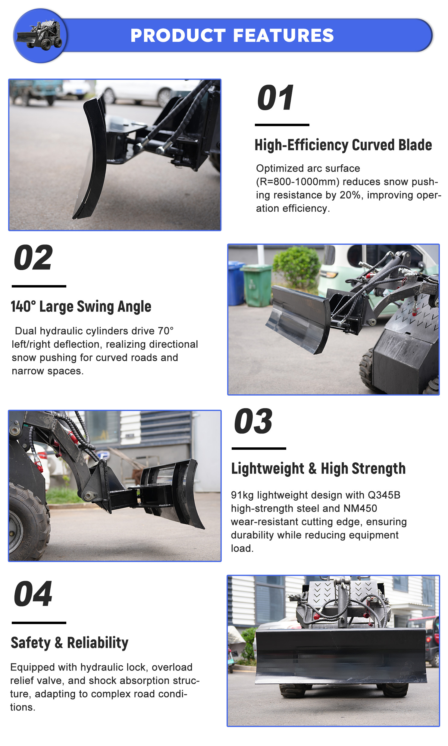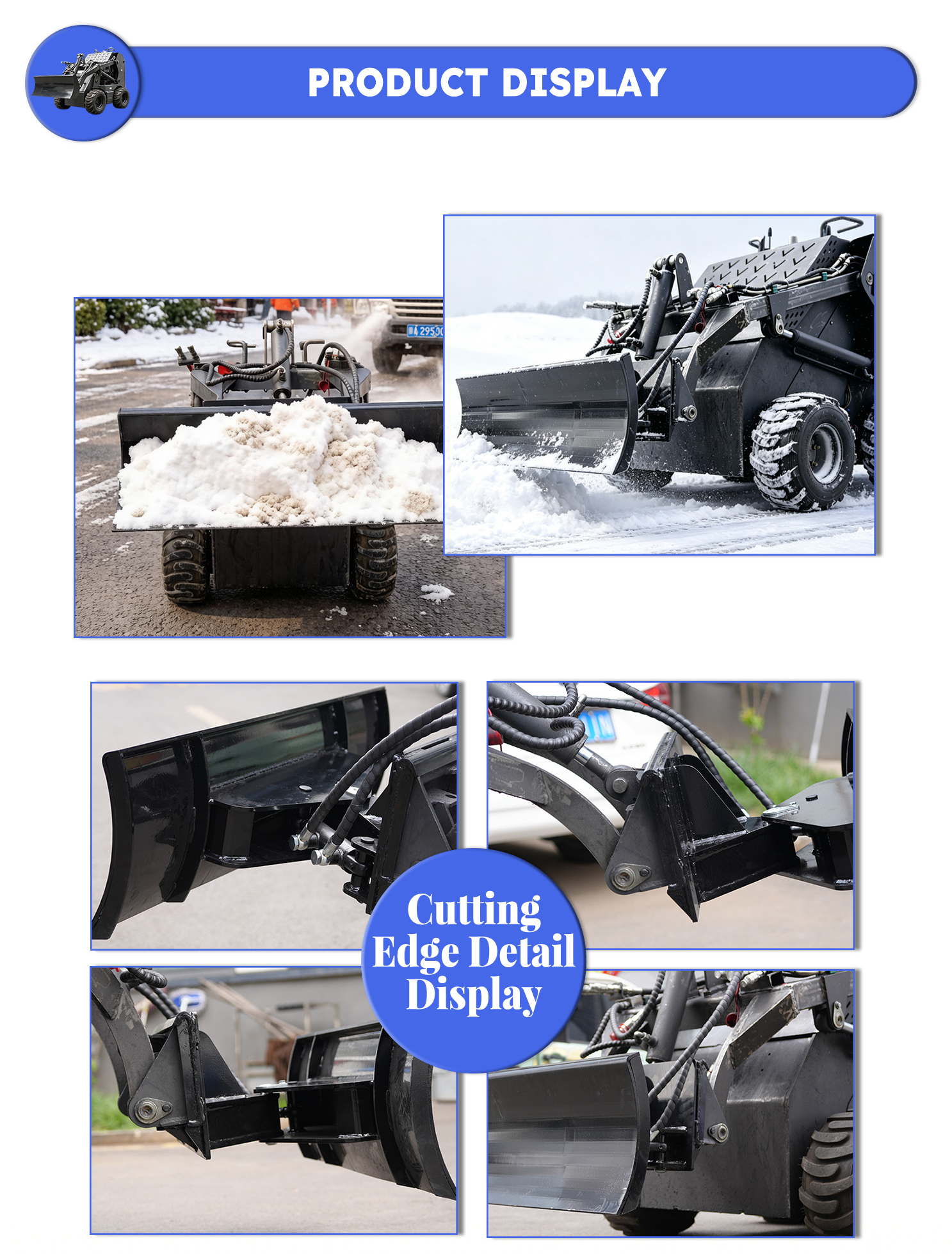 It is mainly used to shovel snow. It can push the snow on the road, square, parking lot and other places to one side, quickly clear the road, steering flexibly, and is especially suitable for snow removal in narrow or crowded places such as communities, parking lots, sidewalks, and airport aprons when equipped with snow shovels