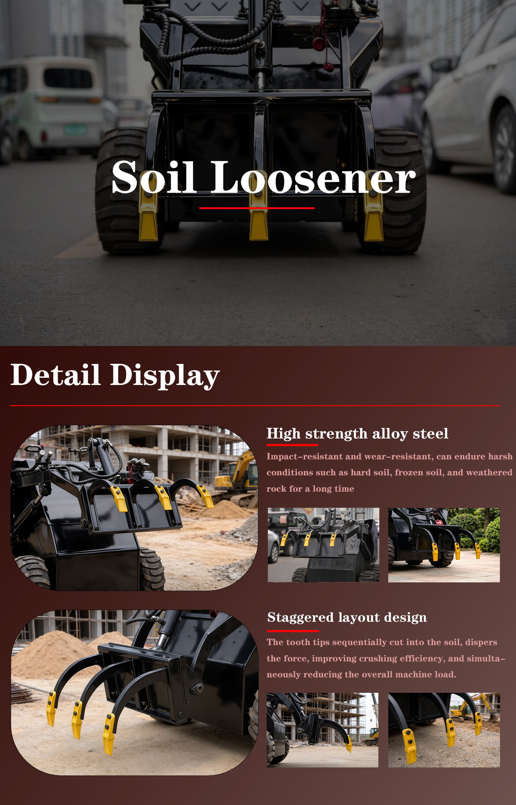 The skid steer ripper is a dedicated hydraulic attachment for skid steer loaders, used for breaking and loosening hard soil, frozen ground, weathered rock, or asphalt pavement. It is widely applied in construction, landscaping, agriculture, and road engineering.